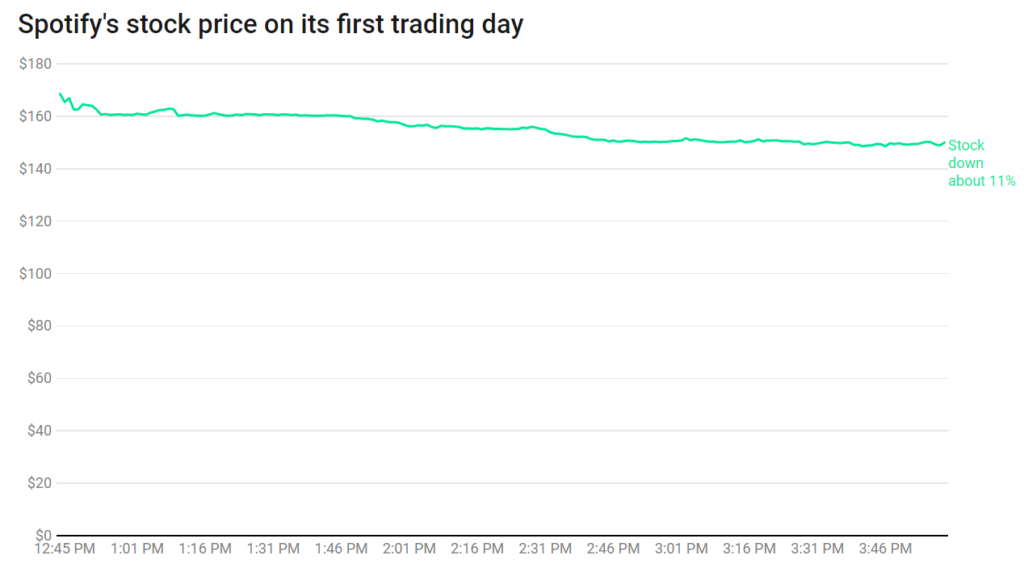 And on the day of IPO, Spotify’s first day of trading ended up surprisingly normal. The stock did not fluctuate wildly, as some might have worried. The stock price opened at about $167 per share and was trading at about $149, down by about 10%, by Tuesday afternoon. There was no usual ‘pop’ in stock price like the conventional IPOs, but really who cares? Spotify is now valued at $26.5 billion market cap, which is about 13% up from the private market trading prior to IPO.